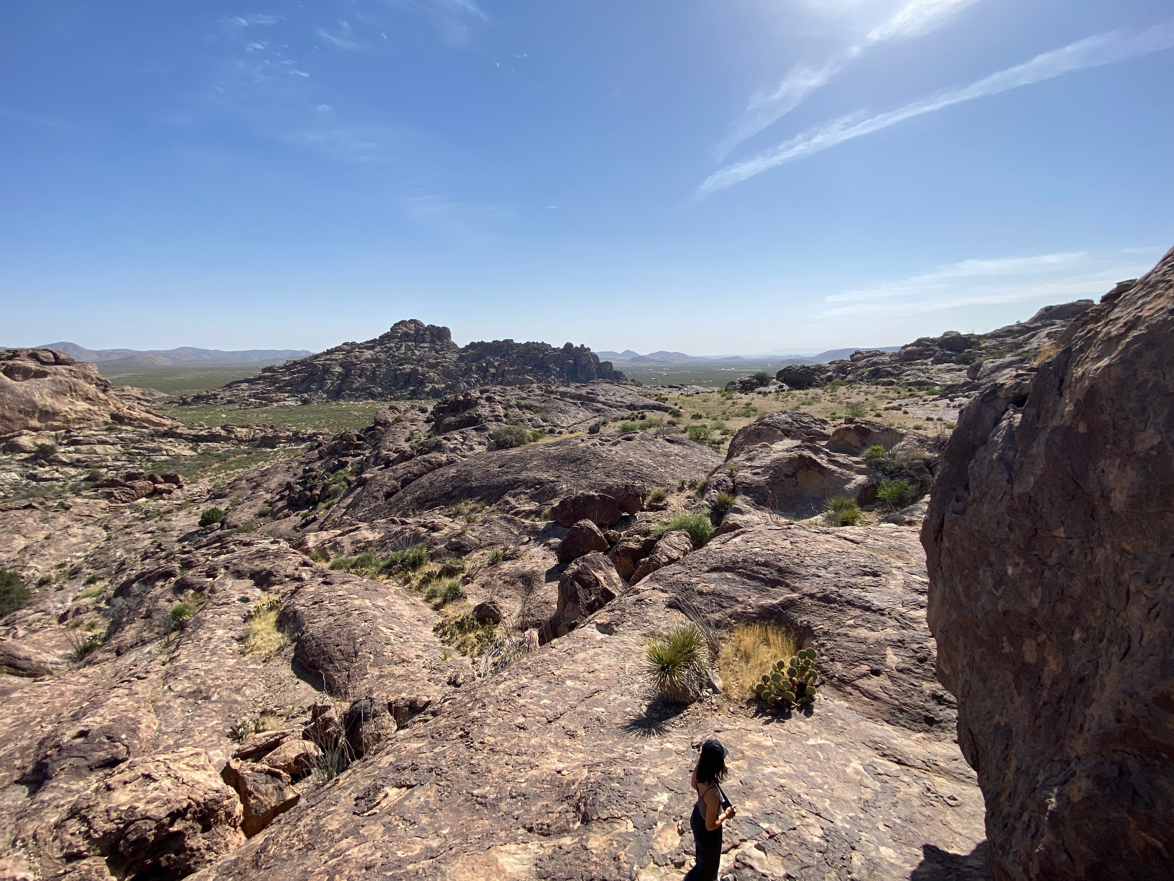 first we checked out Hueco Tanks state park in texas - we didn’t really know what it was, except that Paloma’s coworker said we had to go. turns out it is a beautiful desert oasis! “hueco” is spanish for hollow, and the rocks here have “huecos” that hold water. this attracted people and animals early on, and you can see the pictographs from ancient visitors on some of the rock faces. the rock faces here are also pockmarked with holes, and it is a world-class destination for bouldering - we saw several groups out with their crash pads. most of the park is only accessible via guided tour, but we had fun hiking and climbing around on the North Mountain.